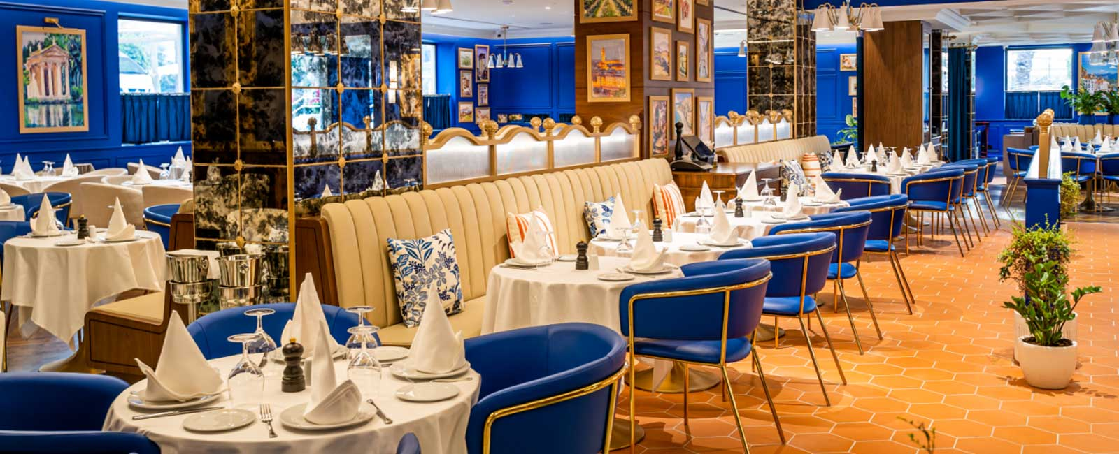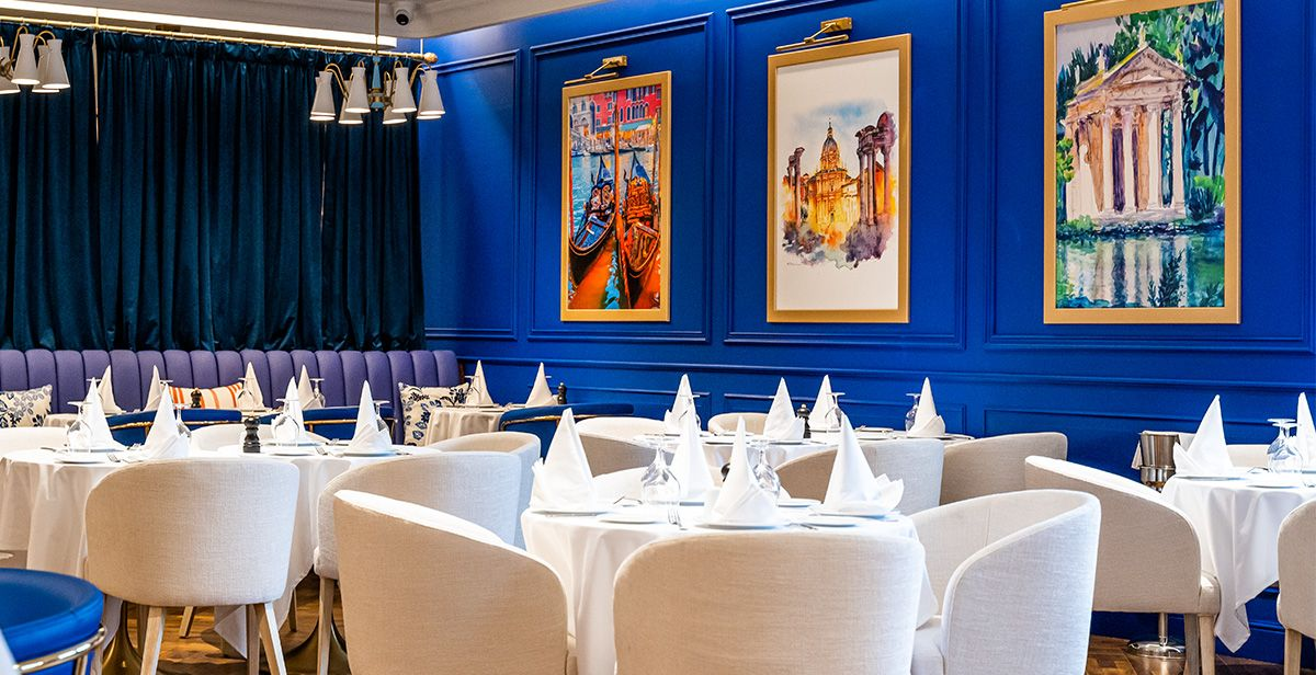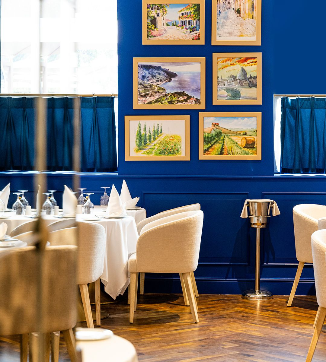 Inside, the décor evokes the charm of an Italian summer. Blue tones mirror the seas of the coastline, while warm yellows and lush greens capture the spirit of the Amalfi Coast. The atmosphere feels both relaxed and sophisticated, creating the perfect setting for memorable meals.