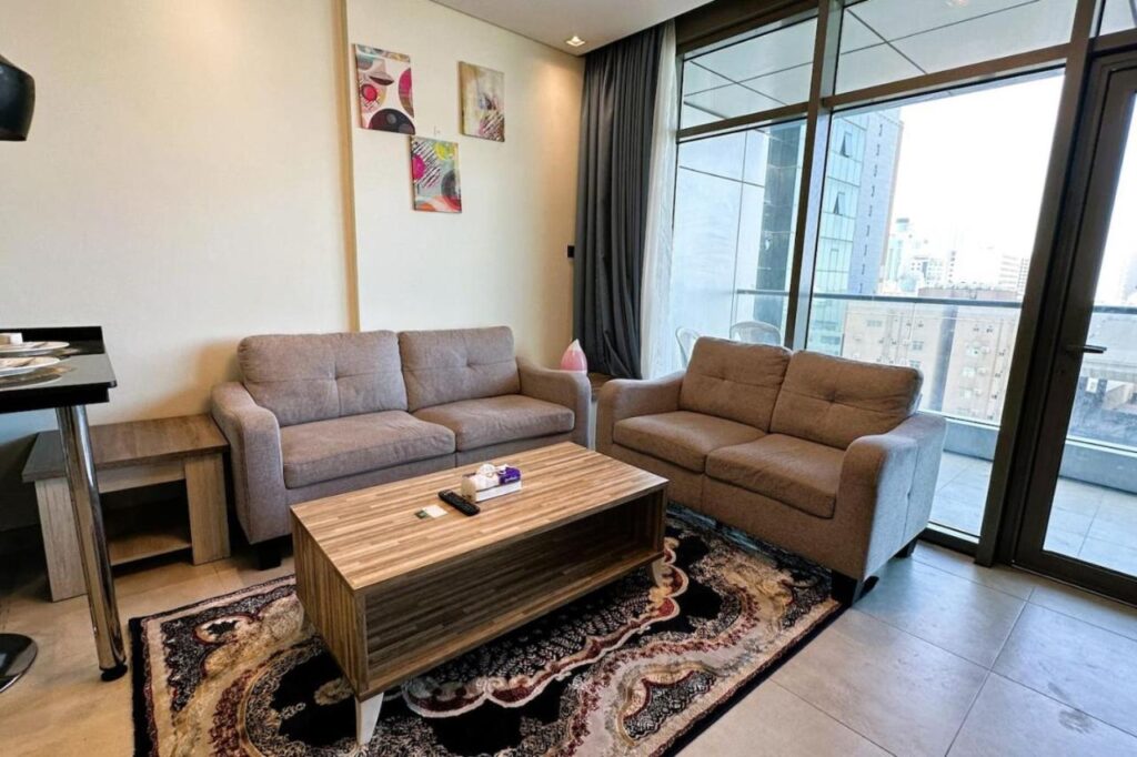 Inside, guests can enjoy modern comforts such as climate control, high-speed internet, and a flat-screen TV. The fully equipped kitchen allows for easy meal preparation, while local dining options—like La Maison restaurant, just a five-minute walk away—add convenience. Public transport is accessible too, with the Dasman-Gudaibiya bus stop about a 10-minute walk from the apartment.