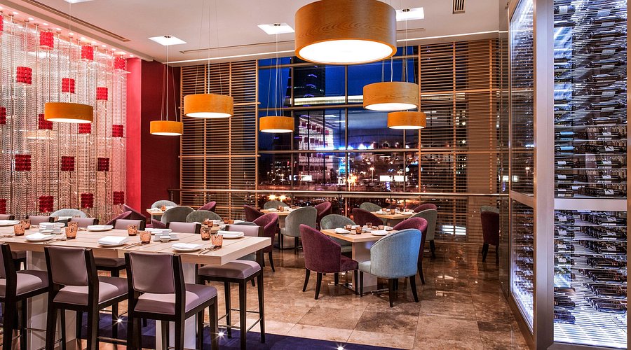 Space & vibe: Chic, low-lit dining room in Downtown Rotana; lounge + main dining with warm tones.