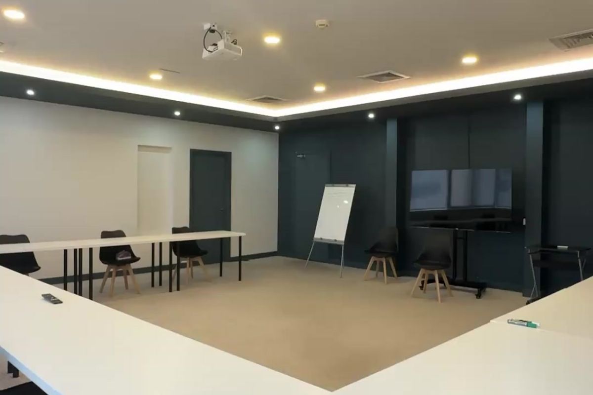Designed for seminars and larger sessions, the training room seats up to 50 people and features a presentation screen. A whiteboard is available on request. This space is suited for training events, talks or community gatherings.